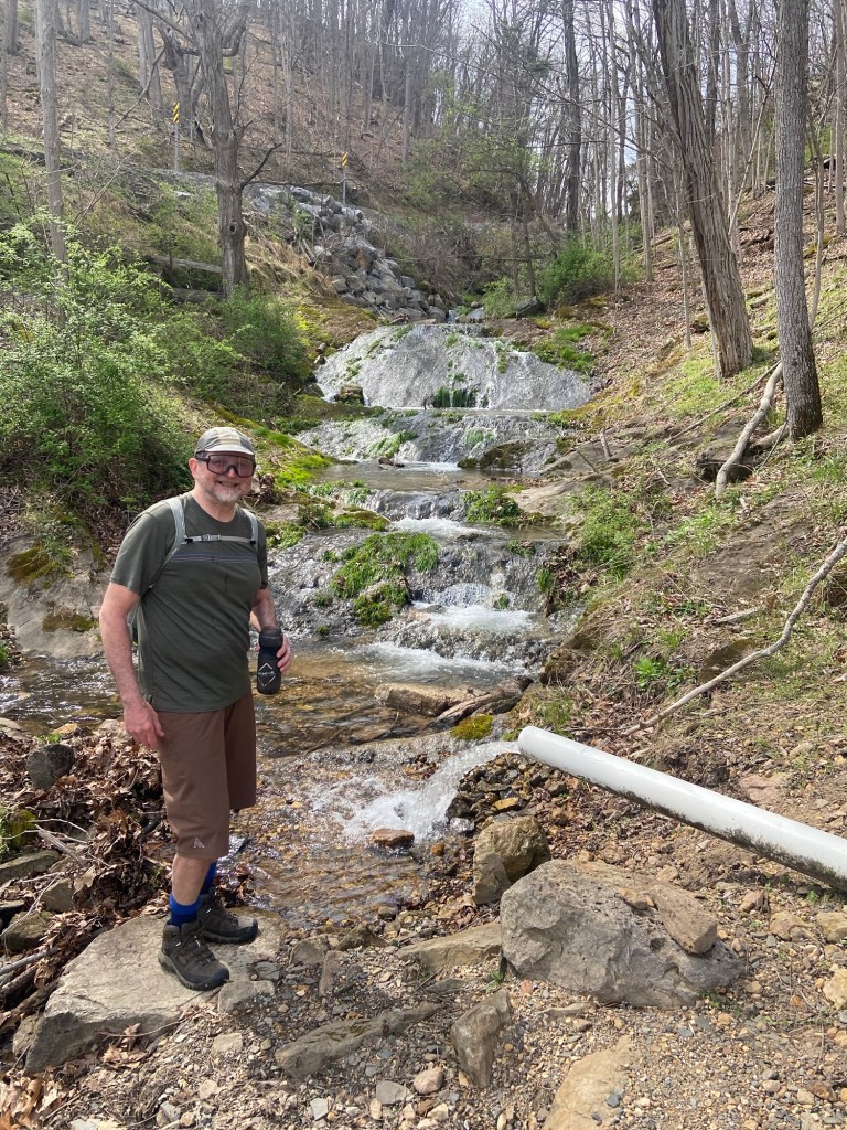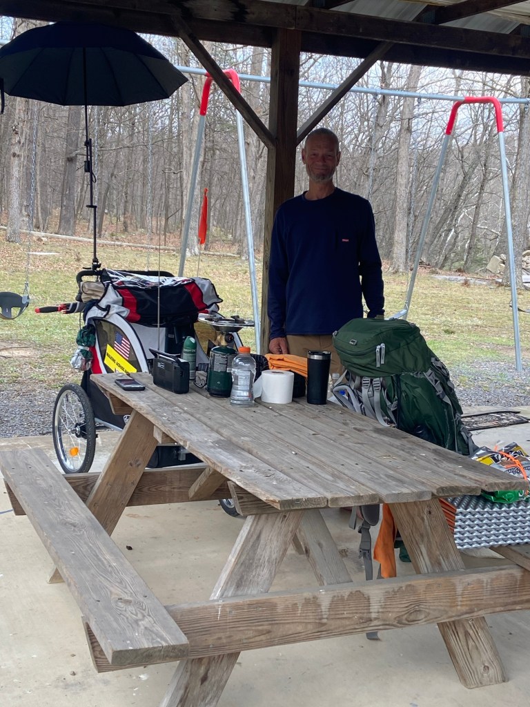 We find a covered pavilion at the Falls Assembly of God Church at 44 miles and call it a day. Richie Wizel, hiker on the American Discovery Trail from coast to coast, is already camped amidst the picnic tables. Richie hikes with a 3-wheeled cart and umbrella. His composite-tipped work boots are high to protect against snakes and are responsible for his trail name, Das Boot.