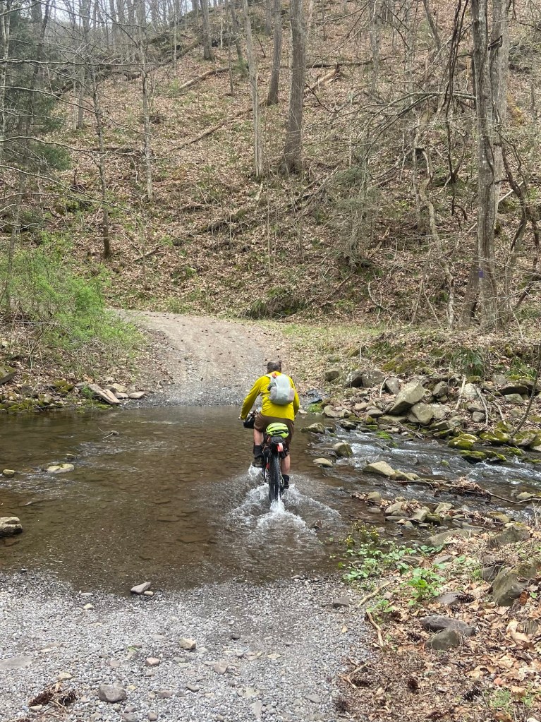 We turn off pavement and start riding Rough Run Road. Our feet get wet but that’s refreshing.