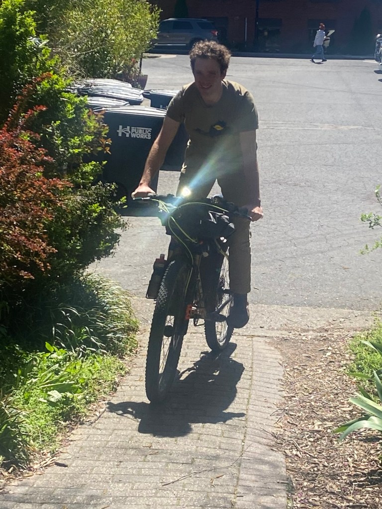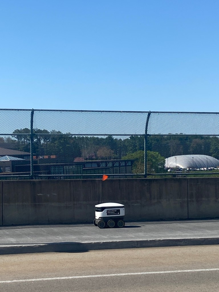 As we ride home through JMU (James Madison University), I nearly take out a starship on a downhill. No cars, no pedestrians, I think the intersection is clear. I only see the squat robot at the last moment because it flashes a green light and backs up onto the sidewalk.