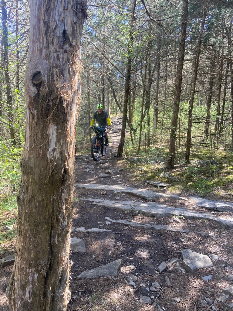 Without jumping over the rugged sections in western Pennsylvania threatened by flooding, we risk turning up in Harrisonburg days after the RockStar Grande Depart. Since there’s only two access points to rental car companies along our route, our compromise is to skip a few hundred miles on The Trillium section. That means we drive from Fairport, New York to Cumberland, Maryland.